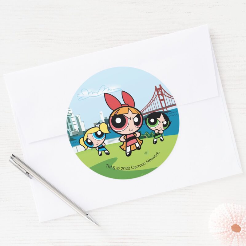Powerpuff Girls Super Fierce Classic Round Sticker vinyl sticker, waterproof durable collectible sticker for laptop, phone, bottle, bike, notebook, helmet, and accessories.