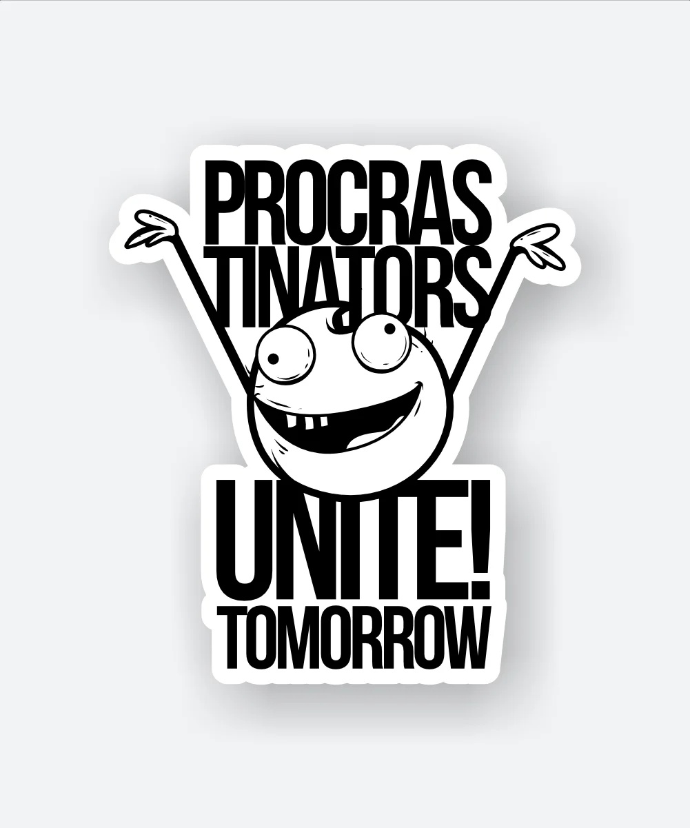Procrastinators Unite Tomorrow Sticker vinyl sticker, waterproof durable collectible sticker for laptop, phone, bottle, bike, notebook, helmet, and accessories.