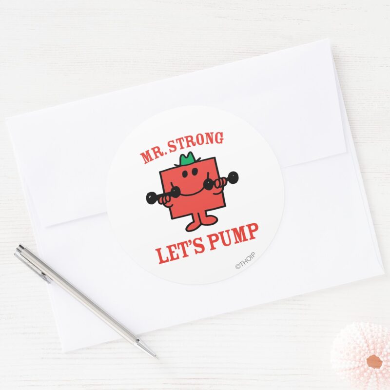 Pumping Iron With Mr. Strong Classic Round Sticker vinyl sticker, waterproof durable collectible sticker for laptop, phone, bottle, bike, notebook, helmet, and accessories.