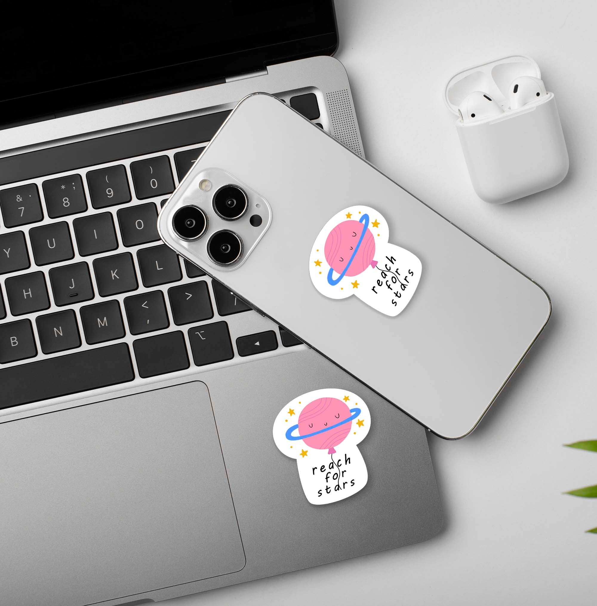 Reach For Stars Space Stickers vinyl sticker, waterproof durable collectible sticker for laptop, phone, bottle, bike, notebook, helmet, and accessories.