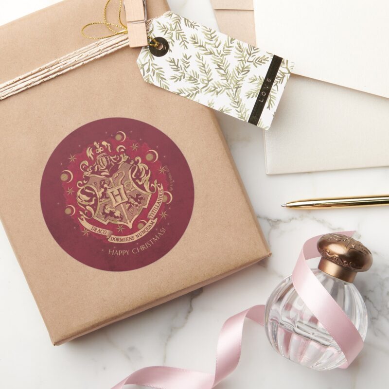 Red HOGWARTS™ Crest Holiday Wreath Classic Round Sticker vinyl sticker, waterproof durable collectible sticker for laptop, phone, bottle, bike, notebook, helmet, and accessories.