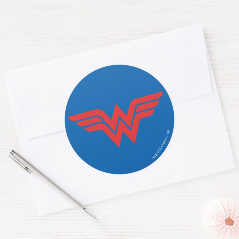 Red Wonder Woman Logo Classic Round Sticker vinyl sticker, waterproof durable collectible sticker for laptop, phone, bottle, bike, notebook, helmet, and accessories.