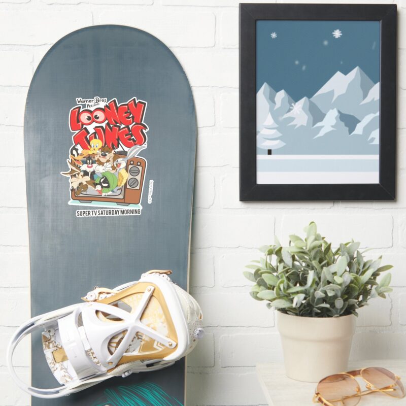Retro LOONEY TUNES™ Bursting From TV Sticker vinyl sticker, waterproof durable collectible sticker for laptop, phone, bottle, bike, notebook, helmet, and accessories.