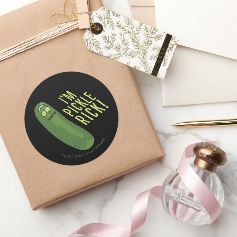 RICK AND MORTY™ Flip The Pickle Classic Round Sticker vinyl sticker, waterproof durable collectible sticker for laptop, phone, bottle, bike, notebook, helmet, and accessories.