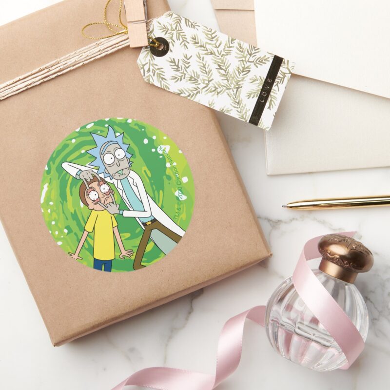 RICK AND MORTY™ Look At That Classic Round Sticker vinyl sticker, waterproof durable collectible sticker for laptop, phone, bottle, bike, notebook, helmet, and accessories.
