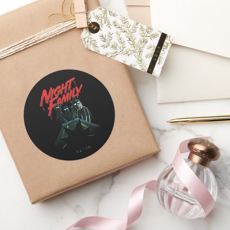RICK AND MORTY™ Night Family Classic Round Sticker vinyl sticker, waterproof durable collectible sticker for laptop, phone, bottle, bike, notebook, helmet, and accessories.