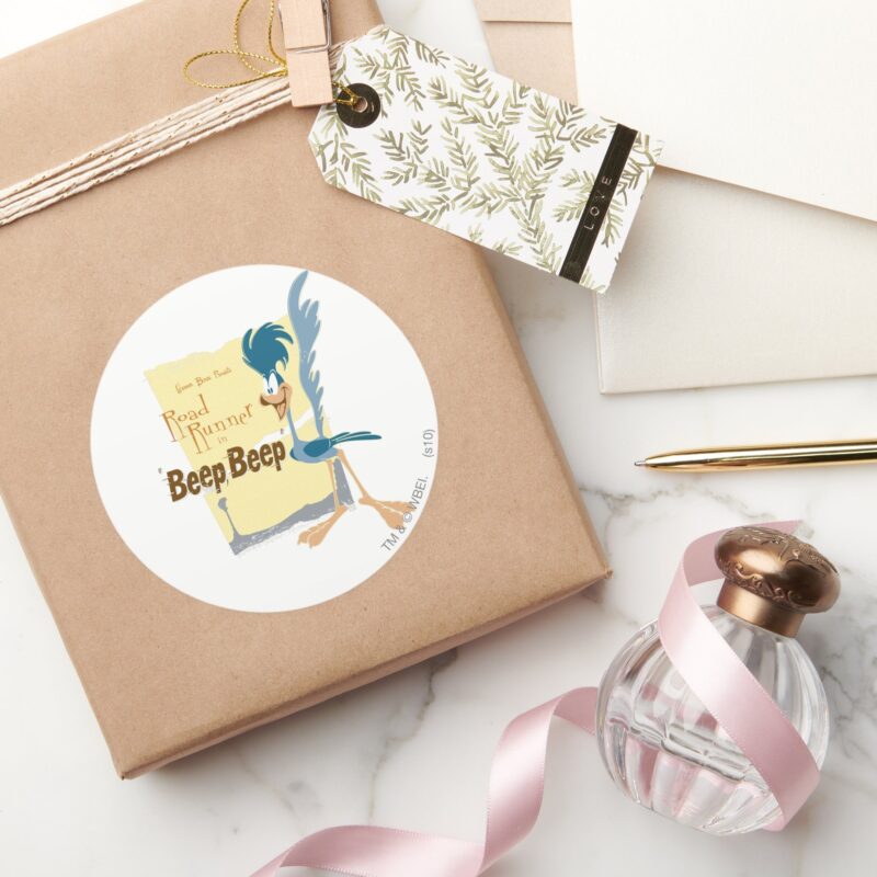 ROAD RUNNER™ BEEP BEEP™ CLASSIC ROUND STICKER vinyl sticker, waterproof durable collectible sticker for laptop, phone, bottle, bike, notebook, helmet, and accessories.