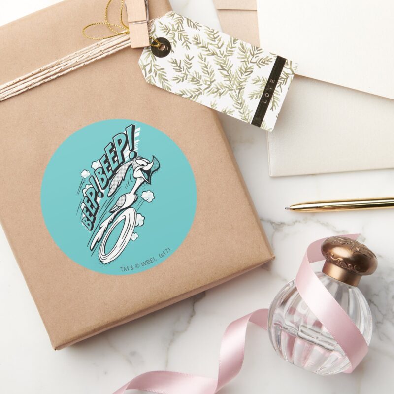 ROAD RUNNER™ BEEP BEEP™ Halftone Classic Round Sticker vinyl sticker, waterproof durable collectible sticker for laptop, phone, bottle, bike, notebook, helmet, and accessories.