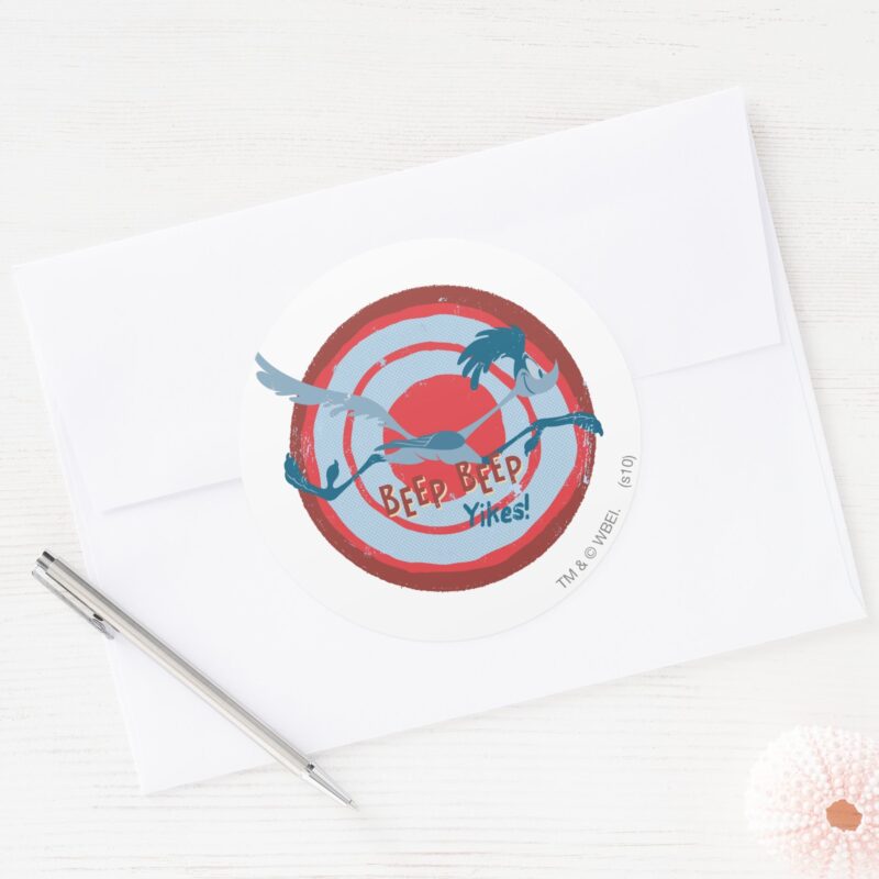 ROAD RUNNER™ BEEP BEEP™ Yikes Classic Round Sticker vinyl sticker, waterproof durable collectible sticker for laptop, phone, bottle, bike, notebook, helmet, and accessories.