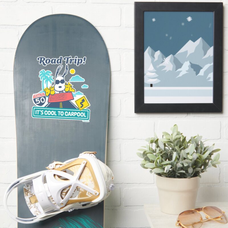 Road Trippin Peanuts Its Cool To Carpool Sticker vinyl sticker, waterproof durable collectible sticker for laptop, phone, bottle, bike, notebook, helmet, and accessories.
