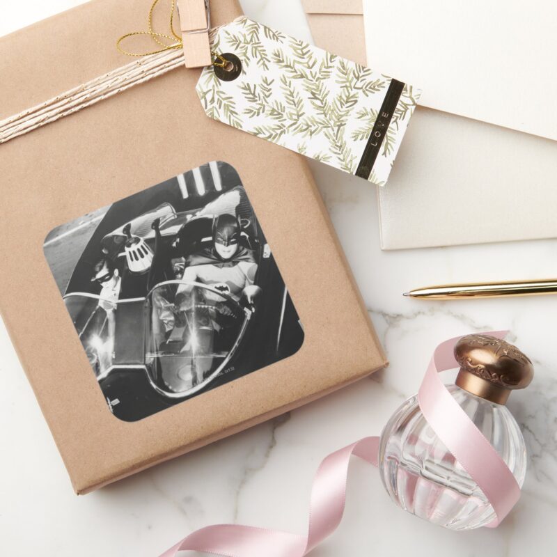 Robin And Batman In Batmobile Square Sticker vinyl sticker, waterproof durable collectible sticker for laptop, phone, bottle, bike, notebook, helmet, and accessories.