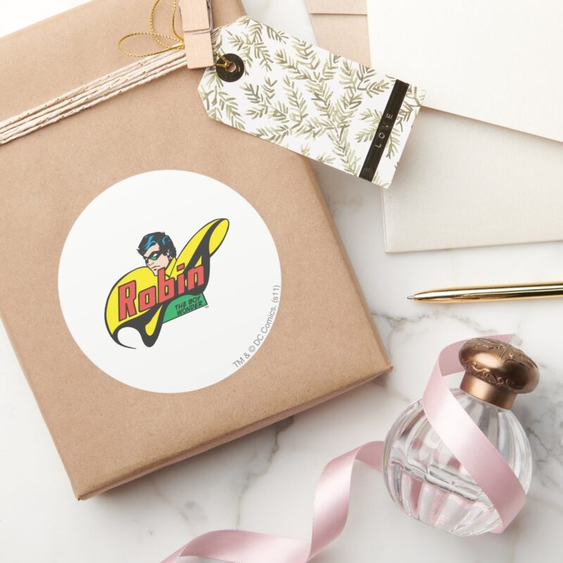 Robin The Boy Wonder Classic Round Sticker vinyl sticker, waterproof durable collectible sticker for laptop, phone, bottle, bike, notebook, helmet, and accessories.