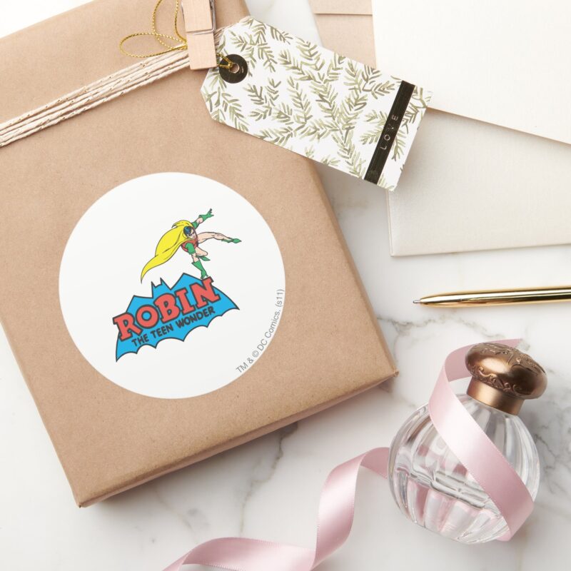 Robin The Teen Wonder Classic Round Sticker vinyl sticker, waterproof durable collectible sticker for laptop, phone, bottle, bike, notebook, helmet, and accessories.