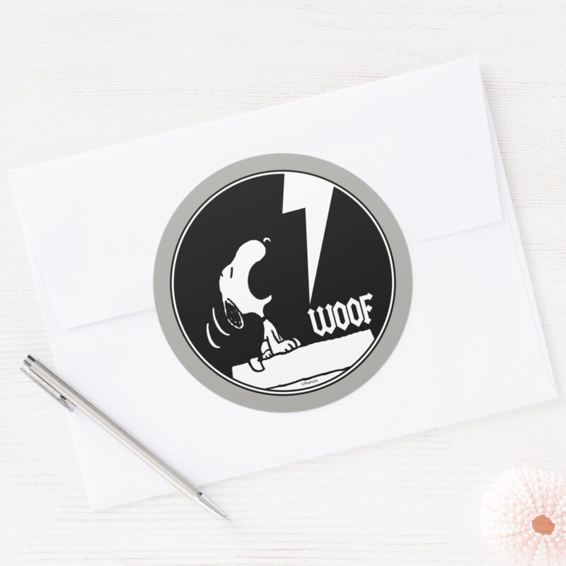 Rock Tees Snoopy Howling Classic Round Sticker vinyl sticker, waterproof durable collectible sticker for laptop, phone, bottle, bike, notebook, helmet, and accessories.