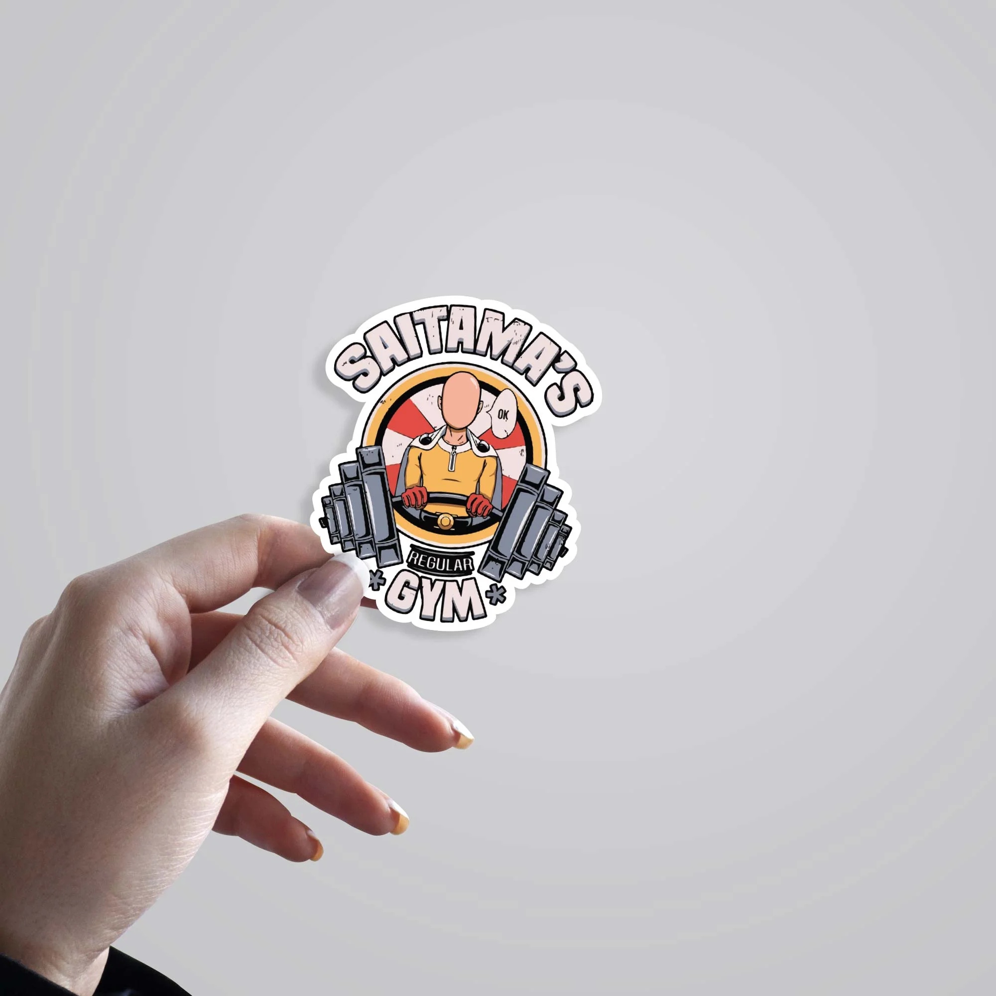 Saitamas Gym Anime Stickers vinyl sticker, waterproof durable collectible sticker for laptop, phone, bottle, bike, notebook, helmet, and accessories.