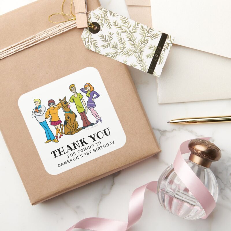 Scooby Doo And The Gang Birthday Thank You Square Sticker vinyl sticker, waterproof durable collectible sticker for laptop, phone, bottle, bike, notebook, helmet, and accessories.
