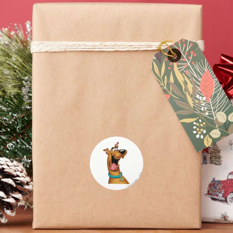 Scooby Doo Excited Face Classic Round Sticker vinyl sticker, waterproof durable collectible sticker for laptop, phone, bottle, bike, notebook, helmet, and accessories.