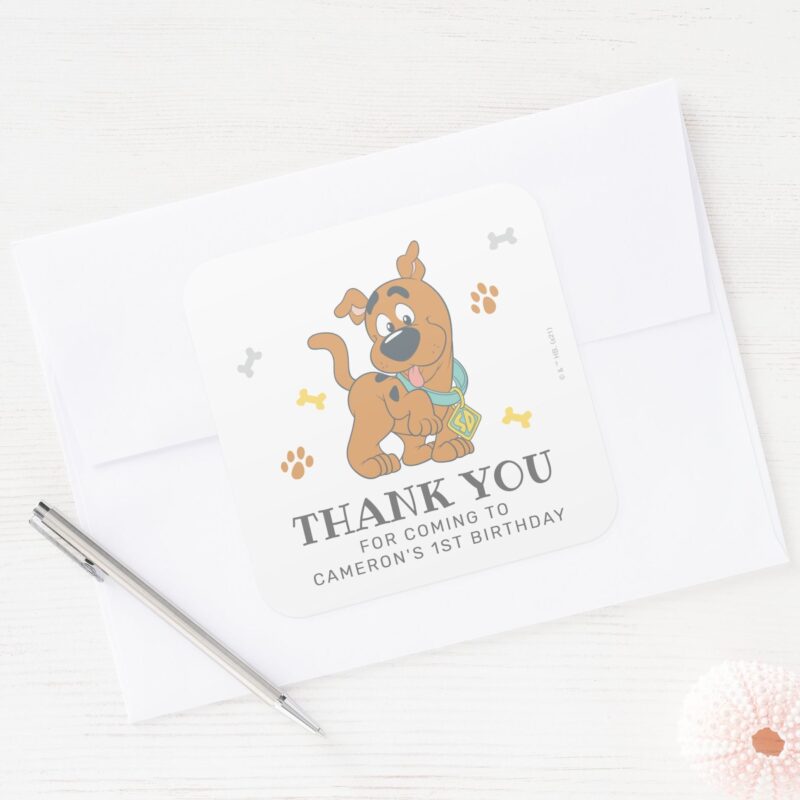 Scooby Doo First Birthday Thank You Square Sticker vinyl sticker, waterproof durable collectible sticker for laptop, phone, bottle, bike, notebook, helmet, and accessories.