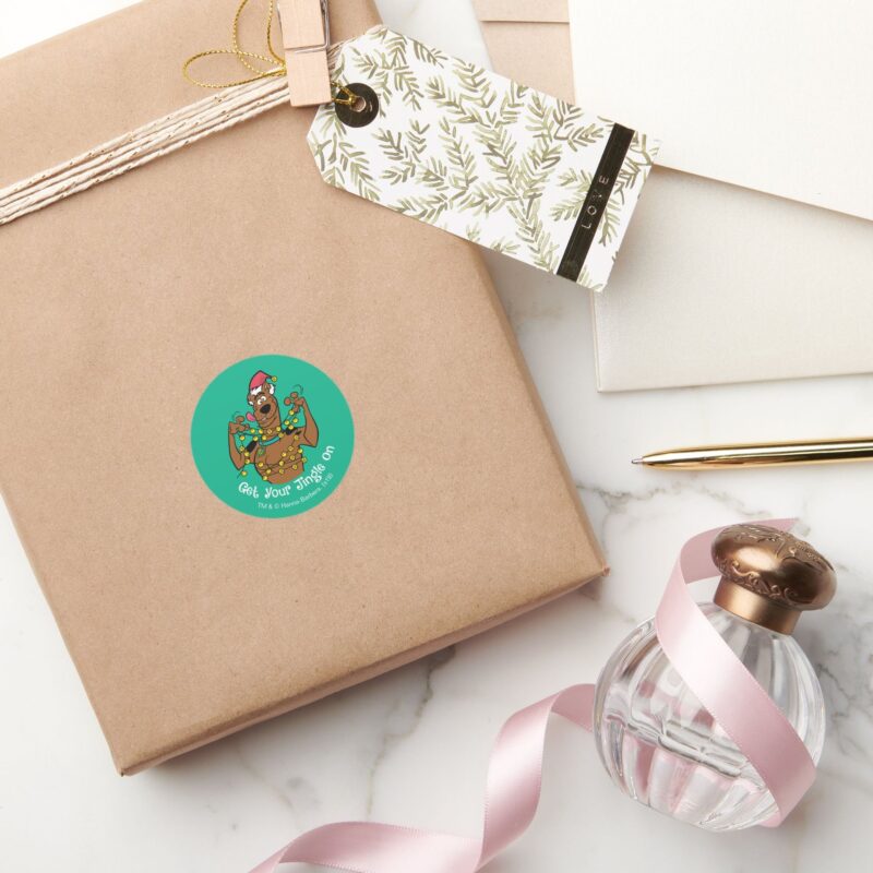 Scooby Doo Get Your Jingle On Classic Round Sticker vinyl sticker, waterproof durable collectible sticker for laptop, phone, bottle, bike, notebook, helmet, and accessories.