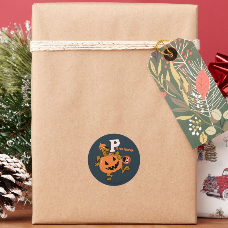 Scooby Doo P Is For Pumpkin Classic Round Sticker vinyl sticker, waterproof durable collectible sticker for laptop, phone, bottle, bike, notebook, helmet, and accessories.