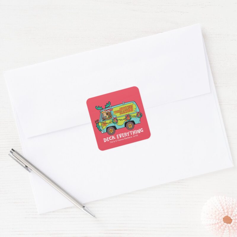 Scooby Doo Shaggy In The Holiday Mystery Machine Square Sticker vinyl sticker, waterproof durable collectible sticker for laptop, phone, bottle, bike, notebook, helmet, and accessories.