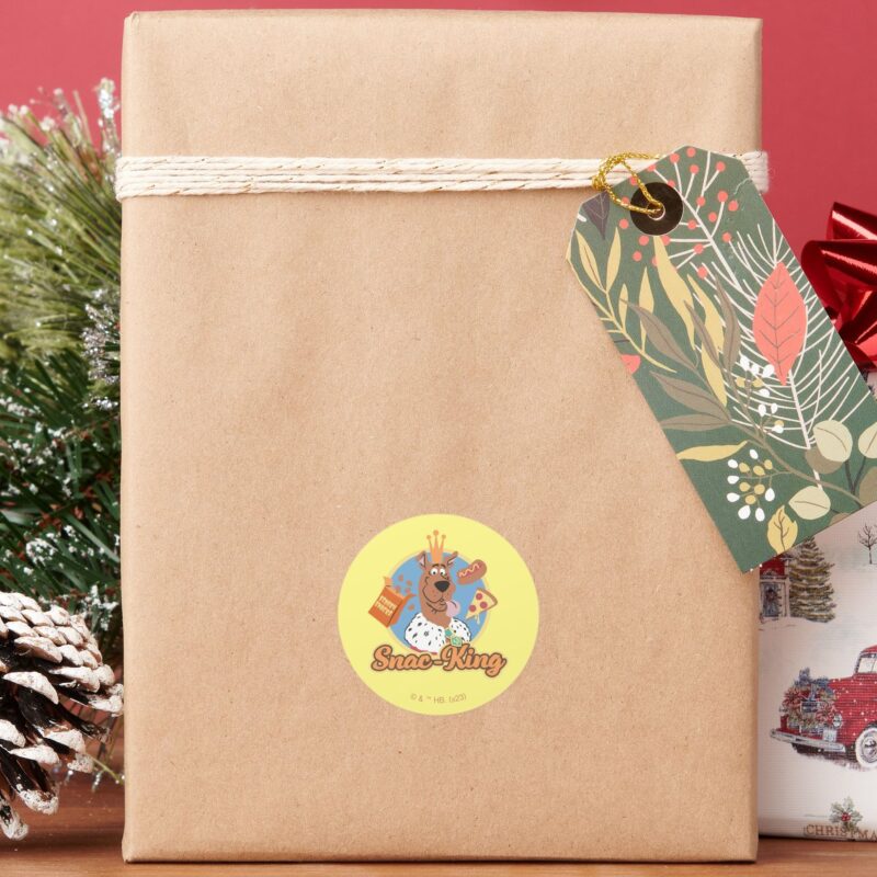 Scooby Doo Snac King Classic Round Sticker vinyl sticker, waterproof durable collectible sticker for laptop, phone, bottle, bike, notebook, helmet, and accessories.