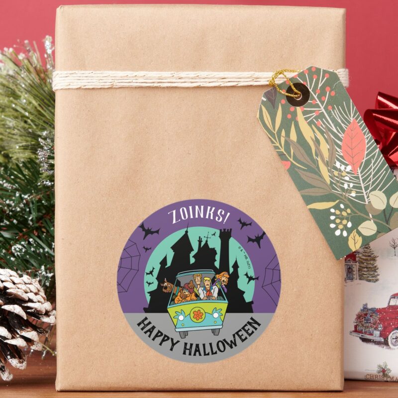 Scooby Doo Spooktacular Halloween Party Classic Round Sticker vinyl sticker, waterproof durable collectible sticker for laptop, phone, bottle, bike, notebook, helmet, and accessories.