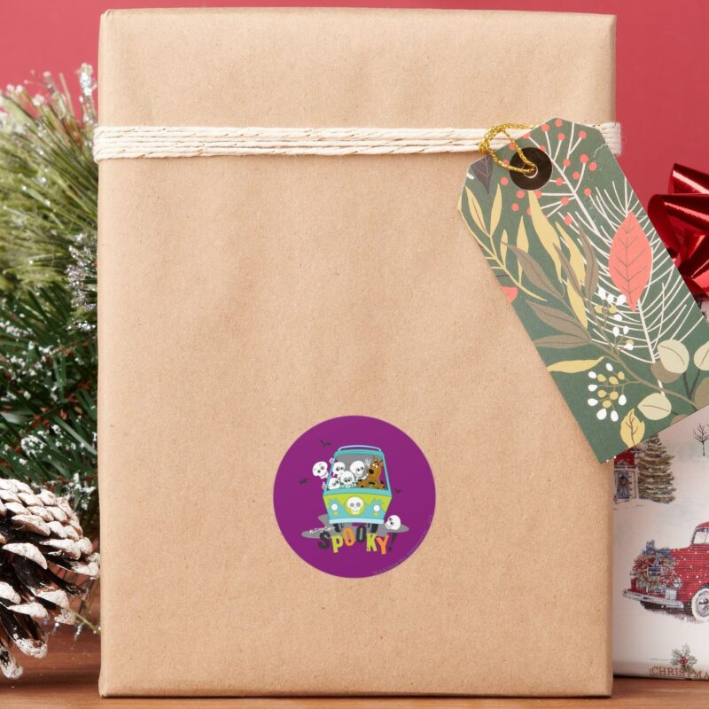 Scooby Doo Spooky Mystery Machine Classic Round Sticker vinyl sticker, waterproof durable collectible sticker for laptop, phone, bottle, bike, notebook, helmet, and accessories.