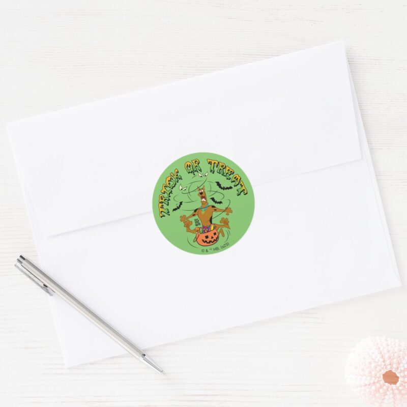 Scooby Doo Trick Of Treat Classic Round Sticker vinyl sticker, waterproof durable collectible sticker for laptop, phone, bottle, bike, notebook, helmet, and accessories.