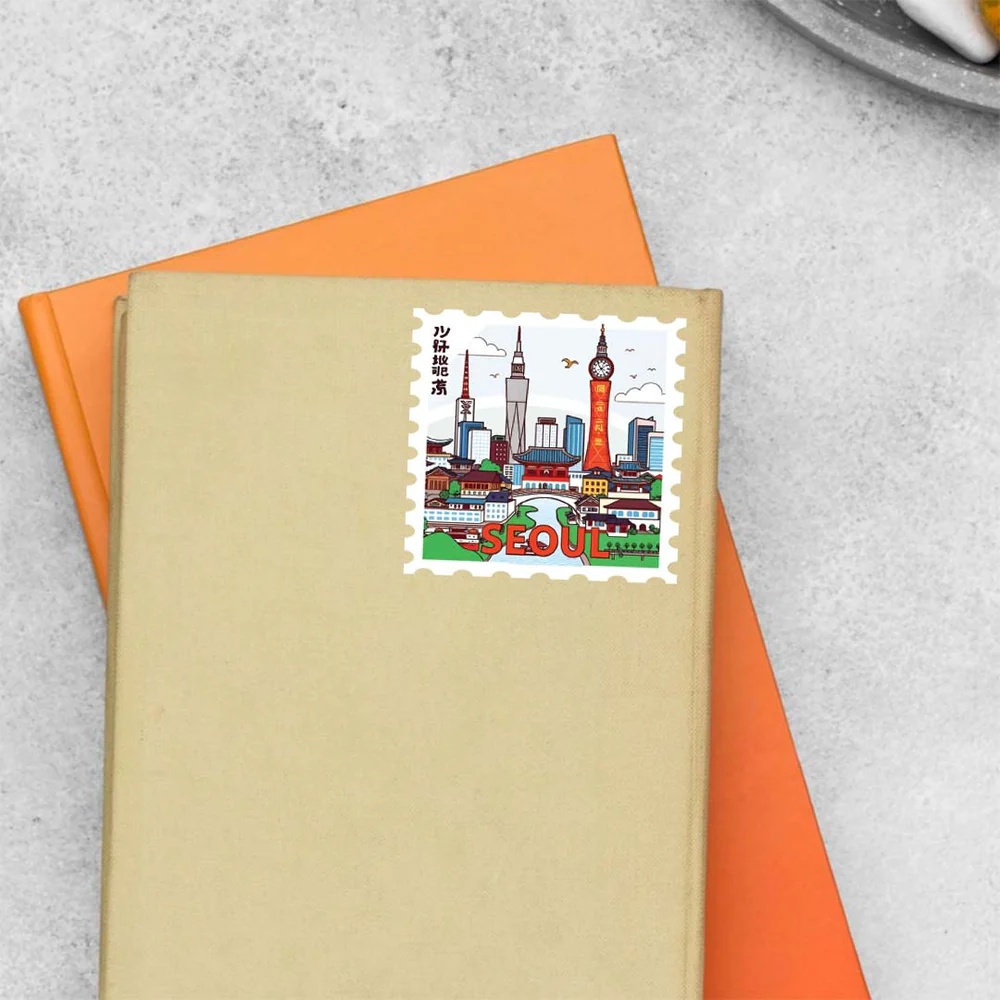 Seoul City Tower Post Stamp Travels Stickers vinyl sticker, waterproof durable collectible sticker for laptop, phone, bottle, bike, notebook, helmet, and accessories.