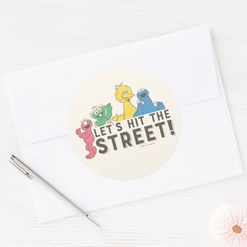 Sesame Street Lets Hit The Street Classic Round Sticker vinyl sticker, waterproof durable collectible sticker for laptop, phone, bottle, bike, notebook, helmet, and accessories.