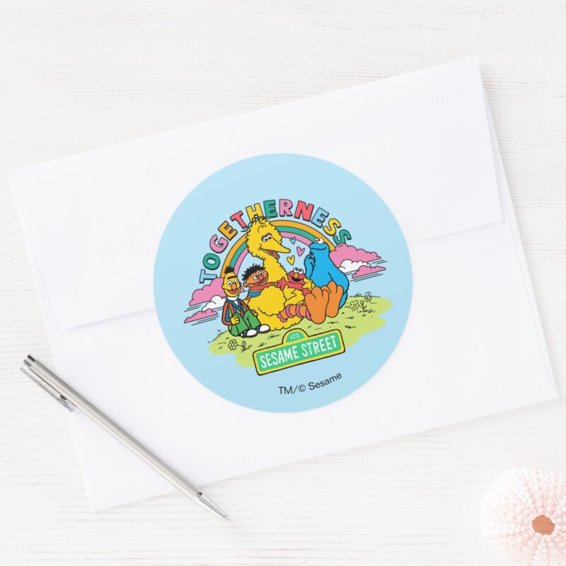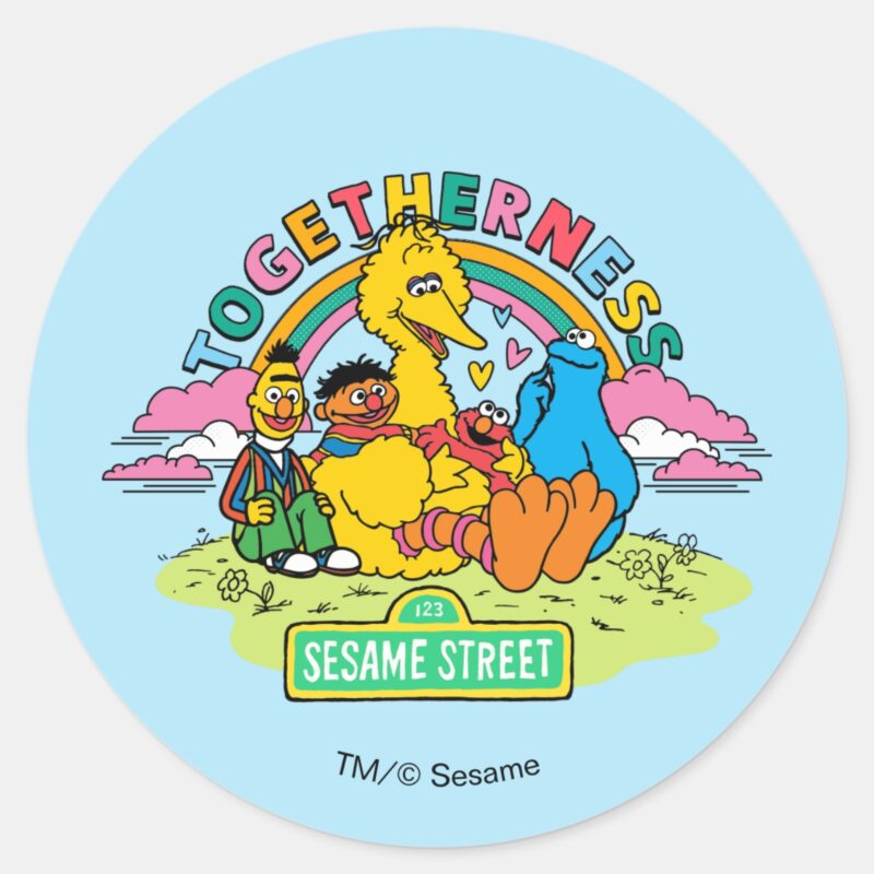 Sesame Street Togetherness Classic Round Sticker vinyl sticker, waterproof durable collectible sticker for laptop, phone, bottle, bike, notebook, helmet, and accessories.