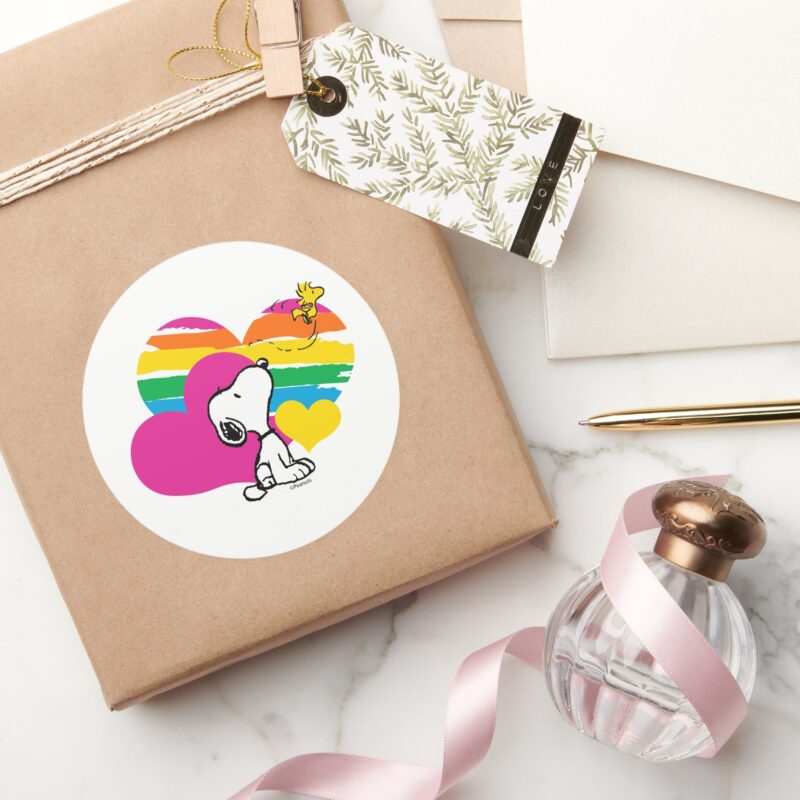 Snoopy And Woodstock Rainbow Hearts Classic Round Sticker vinyl sticker, waterproof durable collectible sticker for laptop, phone, bottle, bike, notebook, helmet, and accessories.
