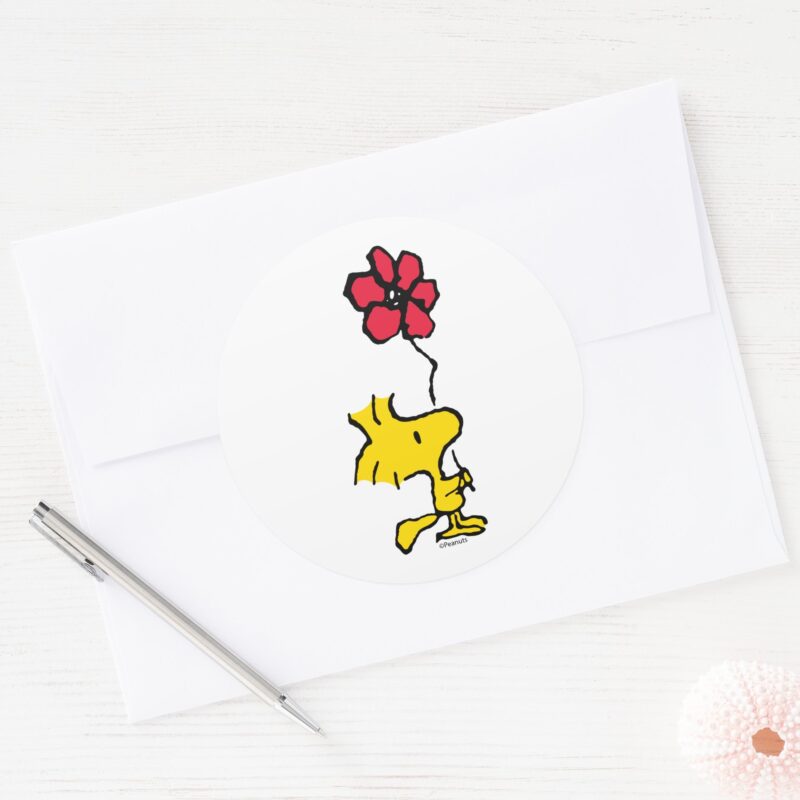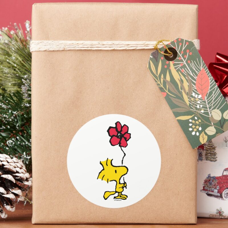 Snoopy So Sweet Flower Classic Round Sticker vinyl sticker, waterproof durable collectible sticker for laptop, phone, bottle, bike, notebook, helmet, and accessories.