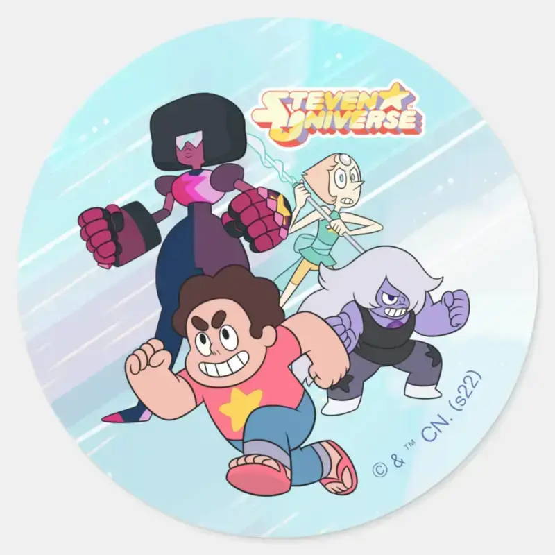 Steven Universe Crystal Gem Group Action Classic Round Sticker vinyl sticker, waterproof durable collectible sticker for laptop, phone, bottle, bike, notebook, helmet, and accessories.