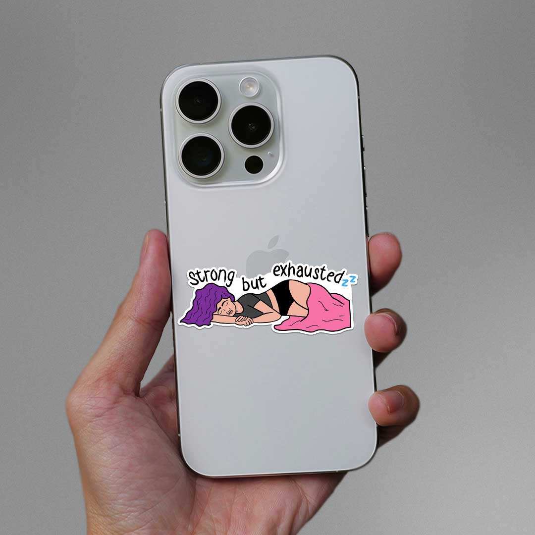 Strong But Exhausted Sticker vinyl sticker, waterproof durable collectible sticker for laptop, phone, bottle, bike, notebook, helmet, and accessories.