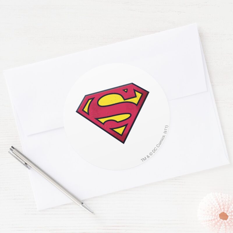 Superman S Shield Dirt Logo Classic Round Sticker vinyl sticker, waterproof durable collectible sticker for laptop, phone, bottle, bike, notebook, helmet, and accessories.
