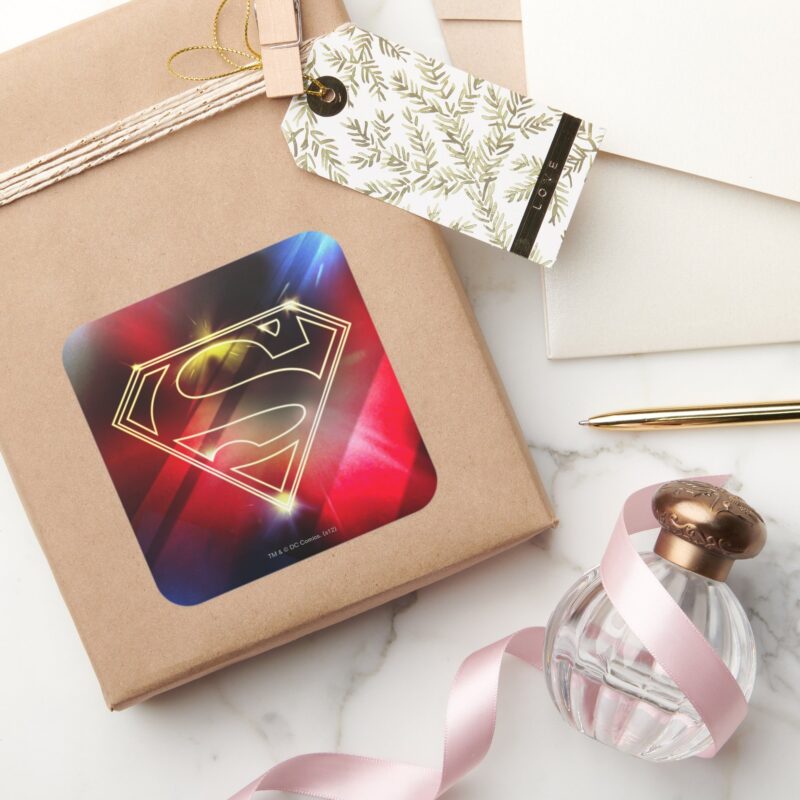 Superman Stylized Shiny Yellow Outline Logo Square Sticker vinyl sticker, waterproof durable collectible sticker for laptop, phone, bottle, bike, notebook, helmet, and accessories.