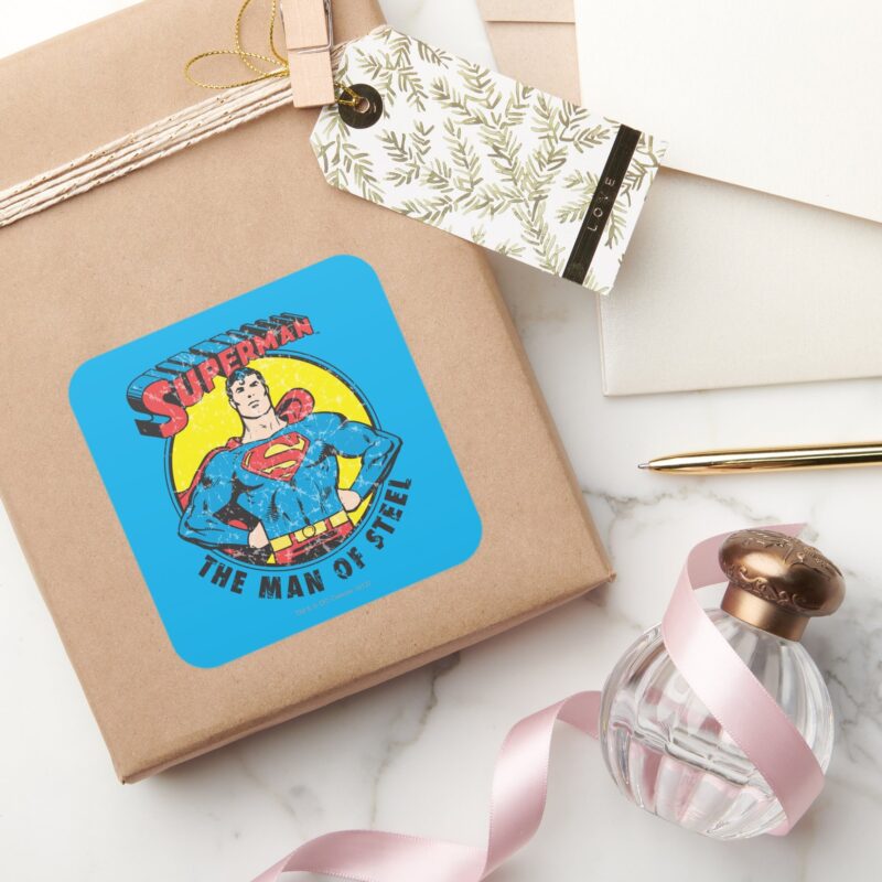 Superman The Man Of Steel Square Sticker vinyl sticker, waterproof durable collectible sticker for laptop, phone, bottle, bike, notebook, helmet, and accessories.
