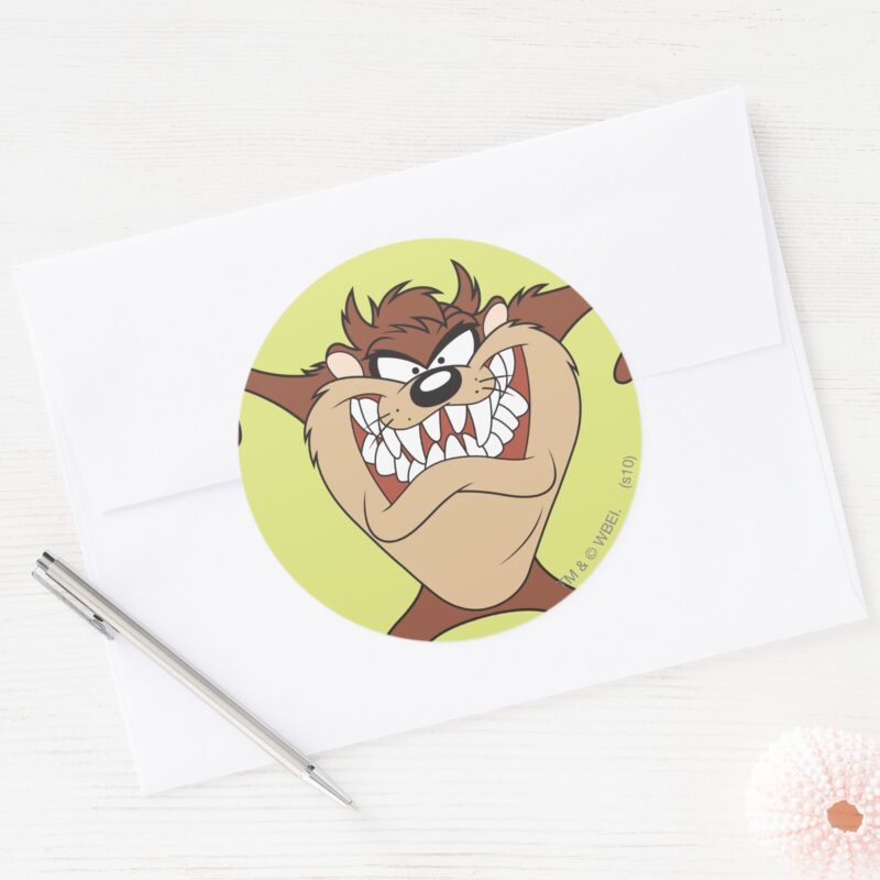TAZ™ Arms Wide Classic Round Sticker vinyl sticker, waterproof durable collectible sticker for laptop, phone, bottle, bike, notebook, helmet, and accessories.