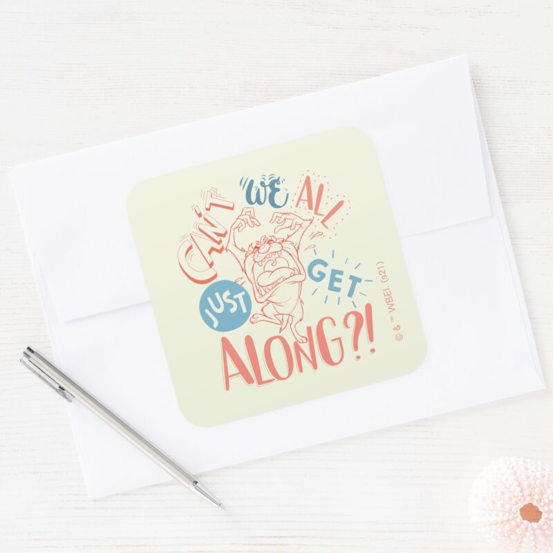 TAZ™ Cant We All Just Get Along Square Sticker vinyl sticker, waterproof durable collectible sticker for laptop, phone, bottle, bike, notebook, helmet, and accessories.