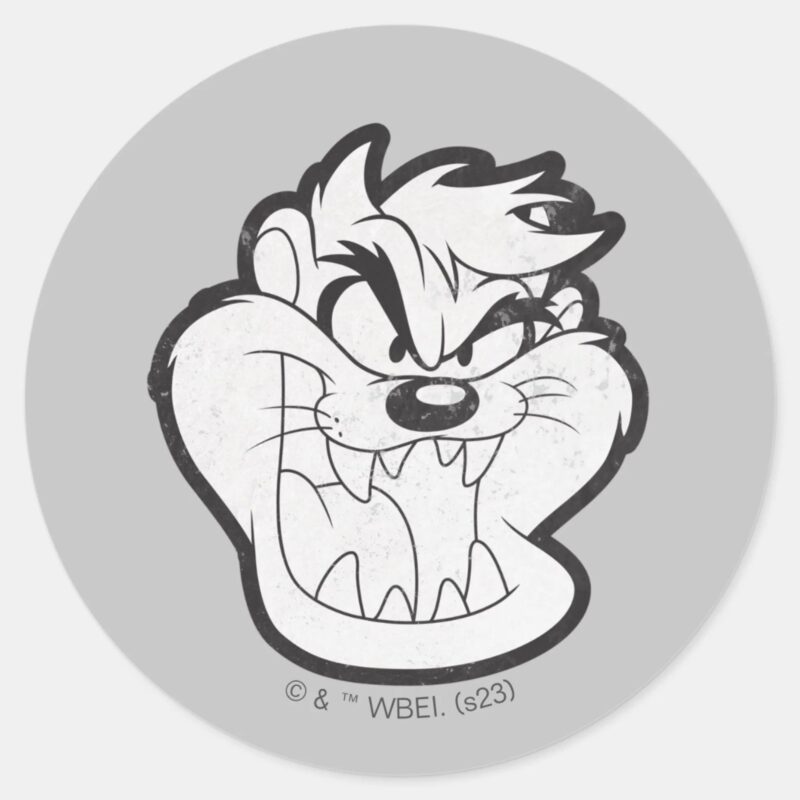 TAZ™ Evil Grin Badge Classic Round Sticker vinyl sticker, waterproof durable collectible sticker for laptop, phone, bottle, bike, notebook, helmet, and accessories.