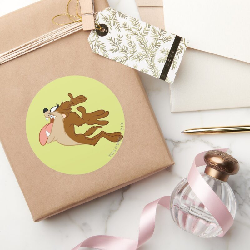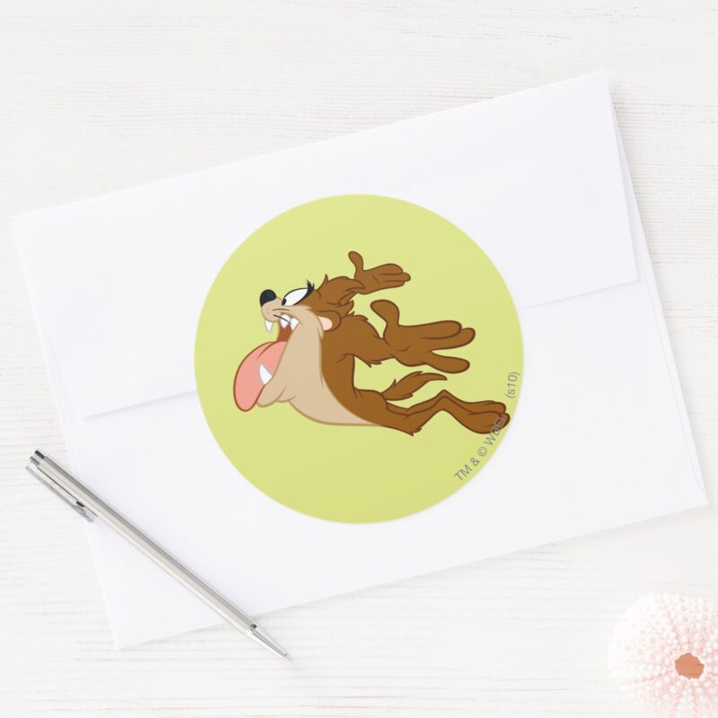 TAZ™ Flying Through The Air Classic Round Sticker vinyl sticker, waterproof durable collectible sticker for laptop, phone, bottle, bike, notebook, helmet, and accessories.