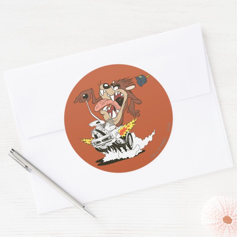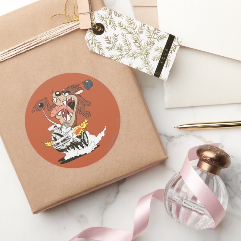 TAZ™ Furious Driving Classic Round Sticker vinyl sticker, waterproof durable collectible sticker for laptop, phone, bottle, bike, notebook, helmet, and accessories.