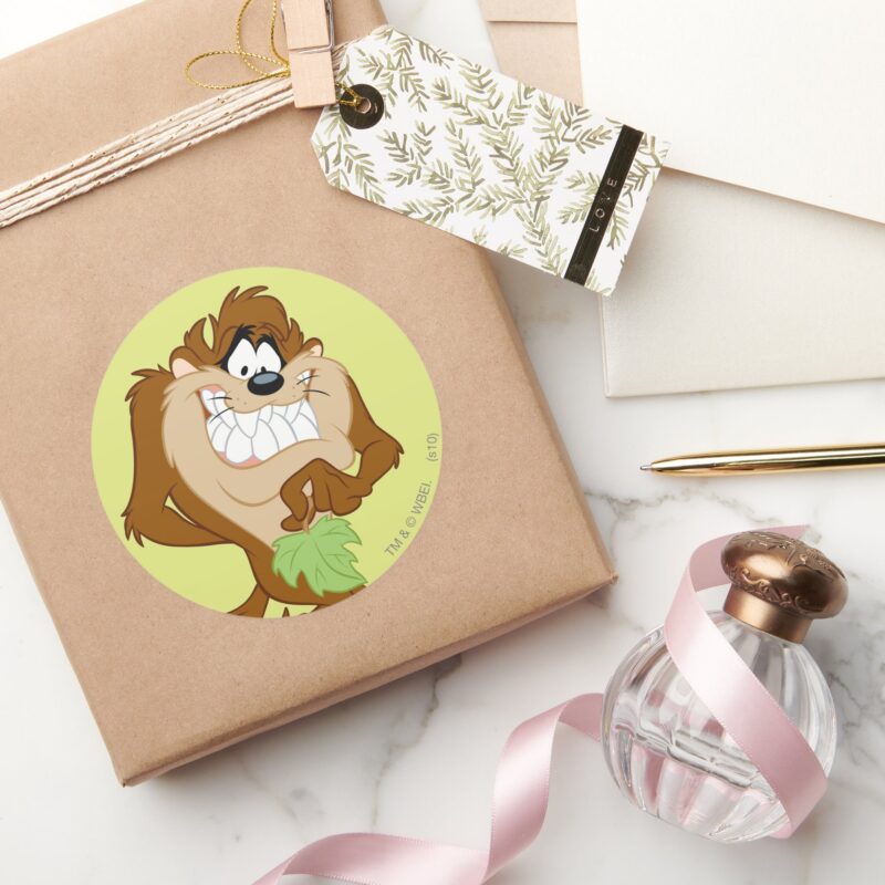 TAZ™ Holding A Leaf Classic Round Sticker vinyl sticker, waterproof durable collectible sticker for laptop, phone, bottle, bike, notebook, helmet, and accessories.