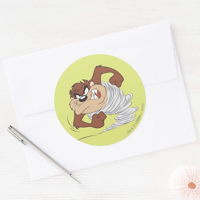 TAZ™ Spinning Fast Classic Round Sticker vinyl sticker, waterproof durable collectible sticker for laptop, phone, bottle, bike, notebook, helmet, and accessories.