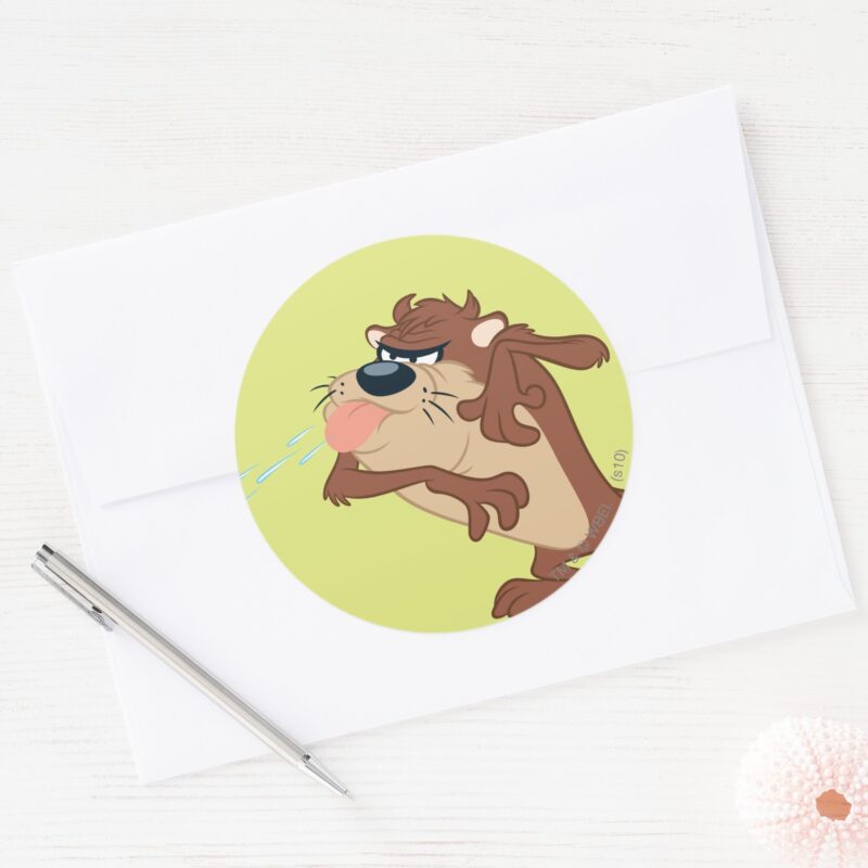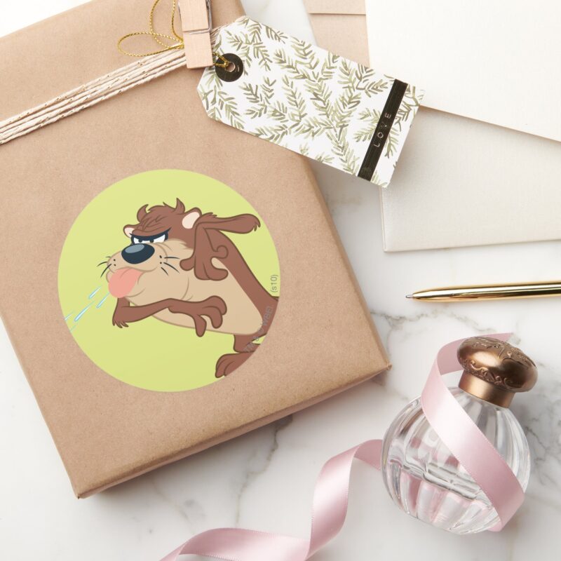 TAZ™ Sticking Out His Tongue Classic Round Sticker vinyl sticker, waterproof durable collectible sticker for laptop, phone, bottle, bike, notebook, helmet, and accessories.