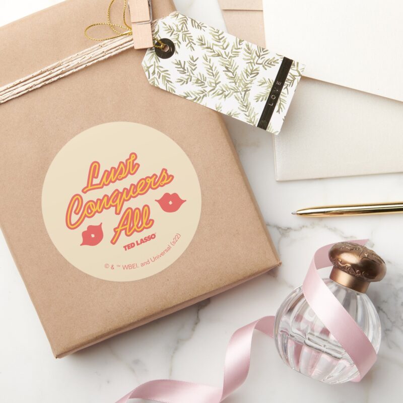 Ted Lasso Lust Conquers All Classic Round Sticker vinyl sticker, waterproof durable collectible sticker for laptop, phone, bottle, bike, notebook, helmet, and accessories.
