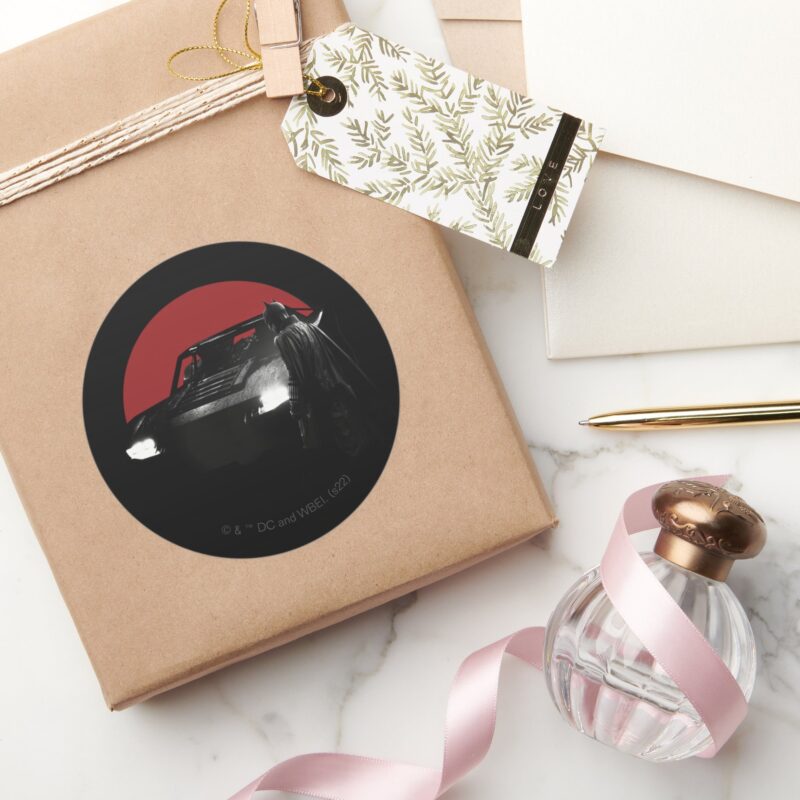 The Batman Batmobile Graphic Classic Round Sticker vinyl sticker, waterproof durable collectible sticker for laptop, phone, bottle, bike, notebook, helmet, and accessories.