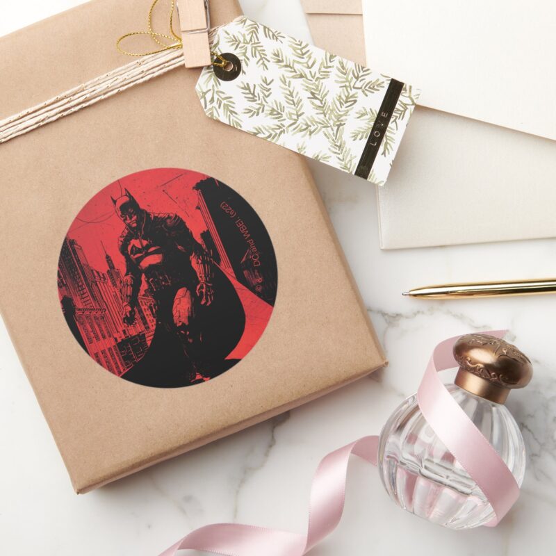 The Batman Comic Book Illustration Classic Round Sticker vinyl sticker, waterproof durable collectible sticker for laptop, phone, bottle, bike, notebook, helmet, and accessories.